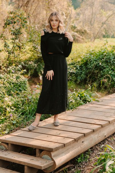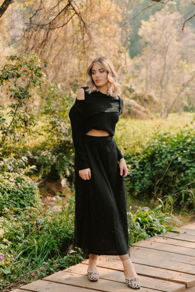 Hey there, fashionista! Meet the Black Diamond Pearl Touch Midi Skirt. This must-have skirt is everything you need to add a touch of flirty grace to your wardrobe. Crafted with breezy fabric, this A-line midi skirt features an on-trend high waist and a playful mesh and black pearl detail that’s sure to turn heads. Perfect for casual outings or dressing up for special occasions, this black beauty is versatile enough to pair with anything from crop tops to blouses. So why wait?